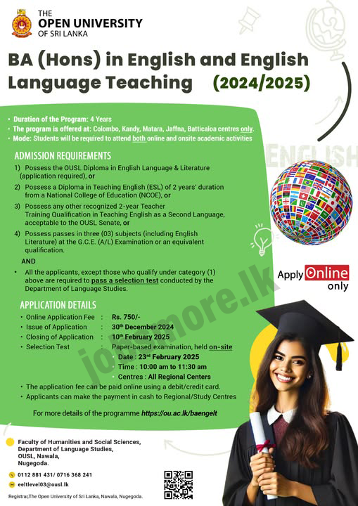 Applications are invited for BA (Hons) in English and English Language Teaching 2024/2025 – OUSL