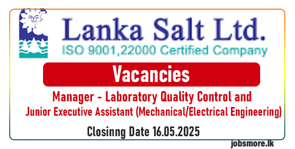 Lanka Salt Limited, Sri Lanka’s leading salt manufacturer and holder of international ISO 9001:2015 and ISO 22000 certifications, has opened applications for key positions, including Manager – Laboratory Quality Control and Junior Executive Assistant (Mechanical/Electrical Engineering).