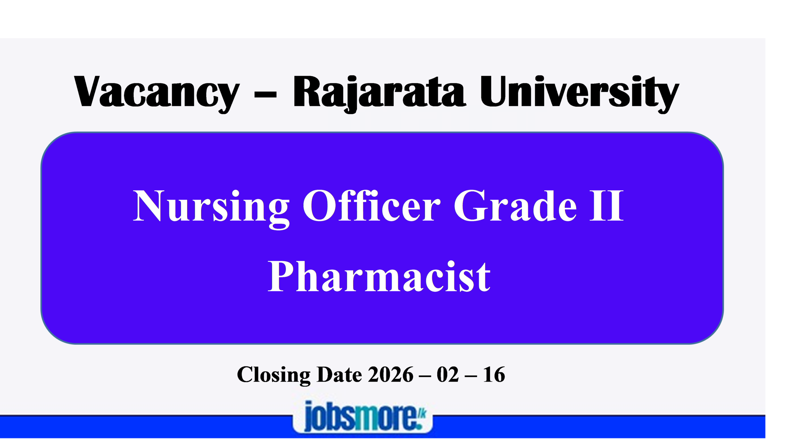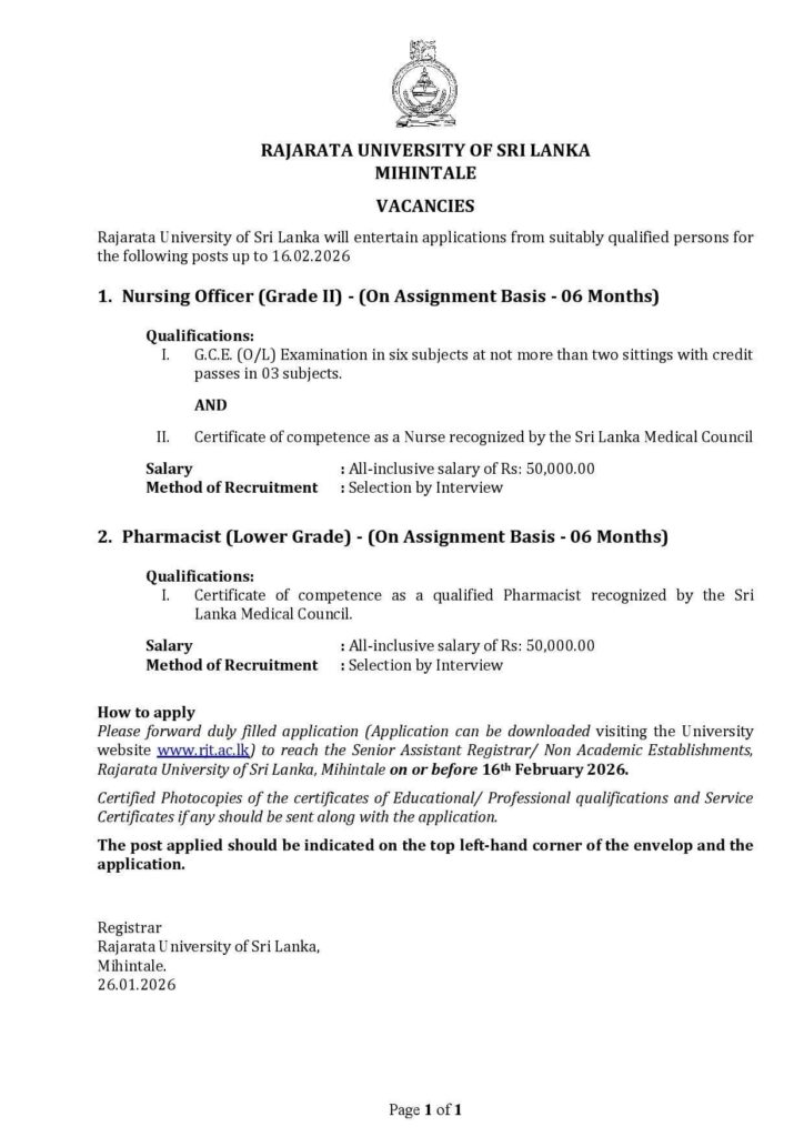 Please forward duly filled application (Application can be downloaded visiting the University website www.rit.ac.lk) to reach the Senior Assistant Registrar/ Non Academic Establishments, Rajarata University of Sri Lanka, Mihintale on or before 16th February 2026.