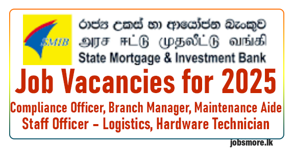 The State Mortgage & Investment Bank (SMIB), Sri Lanka’s premier housing bank, has unveiled a range of career opportunities for qualified professionals. The vacancies span key roles, including Compliance Officer, Branch Manager, Staff Officer – Logistics, Hardware Technician, and Maintenance Aide, offering competitive remuneration packages and allowances.
